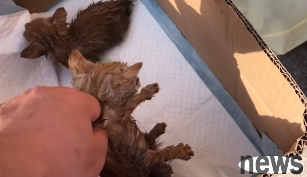 The cute little kittens were mercilessly thrown into the trash can. They were soaked and could only tremble helplessly.