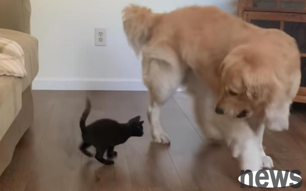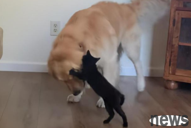 An owner in the United States raised a golden retriever Ernie, and later added a little black cat Olive, making him both a cat and a dog! What makes the owner happy is that Ernie is like a big brother and takes good care of the kitten!