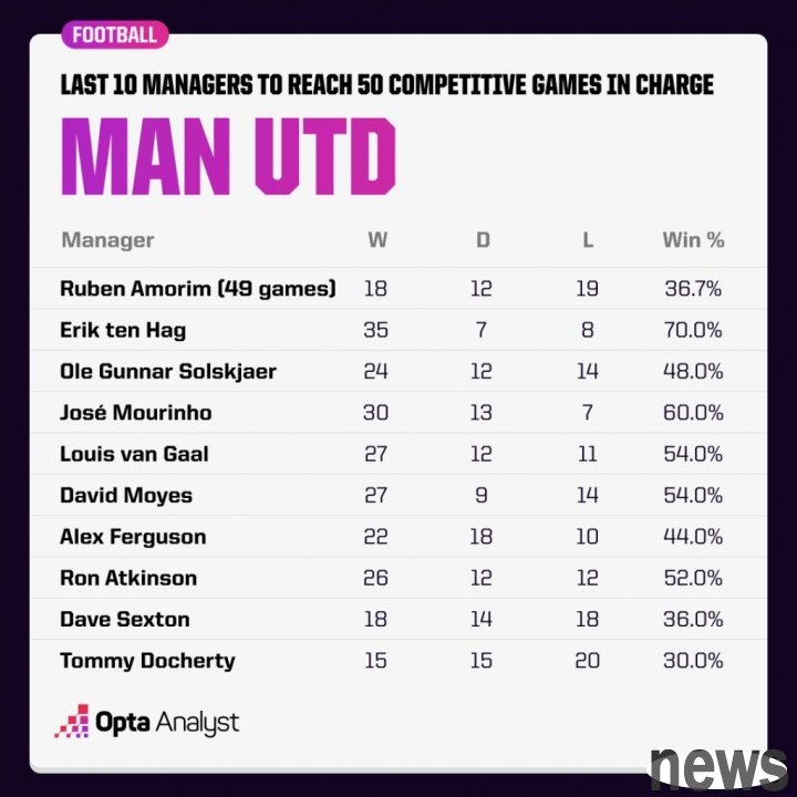 's match against Sunderland will be Amorin's 50th game in coaching Manchester United, but none of his five predecessors, Moyes, Van Gaal, Mourinho, Solskjaer and Tenhamhe, won the 50-game milestone in coaching Manchester United.