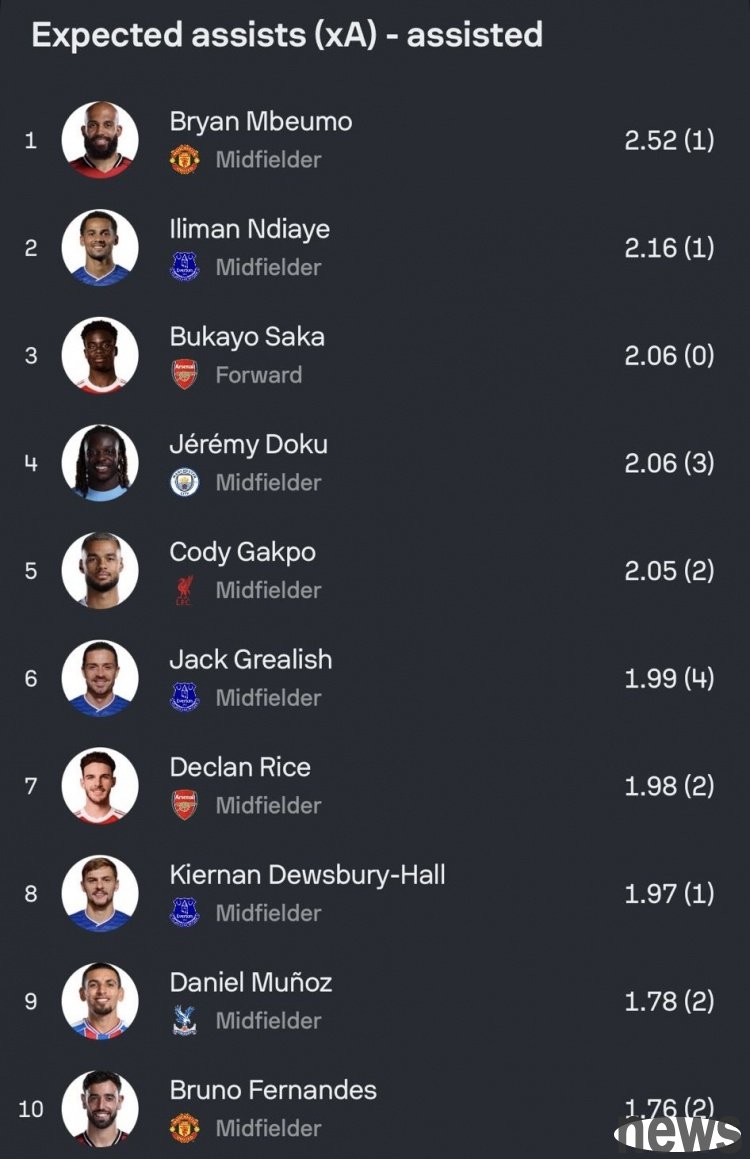 The media counted the expected assists data of players in the Premier League this season and listed the list. Mbemo topped the list with 2.52 expected assists, followed by Ndiaye and Saka.