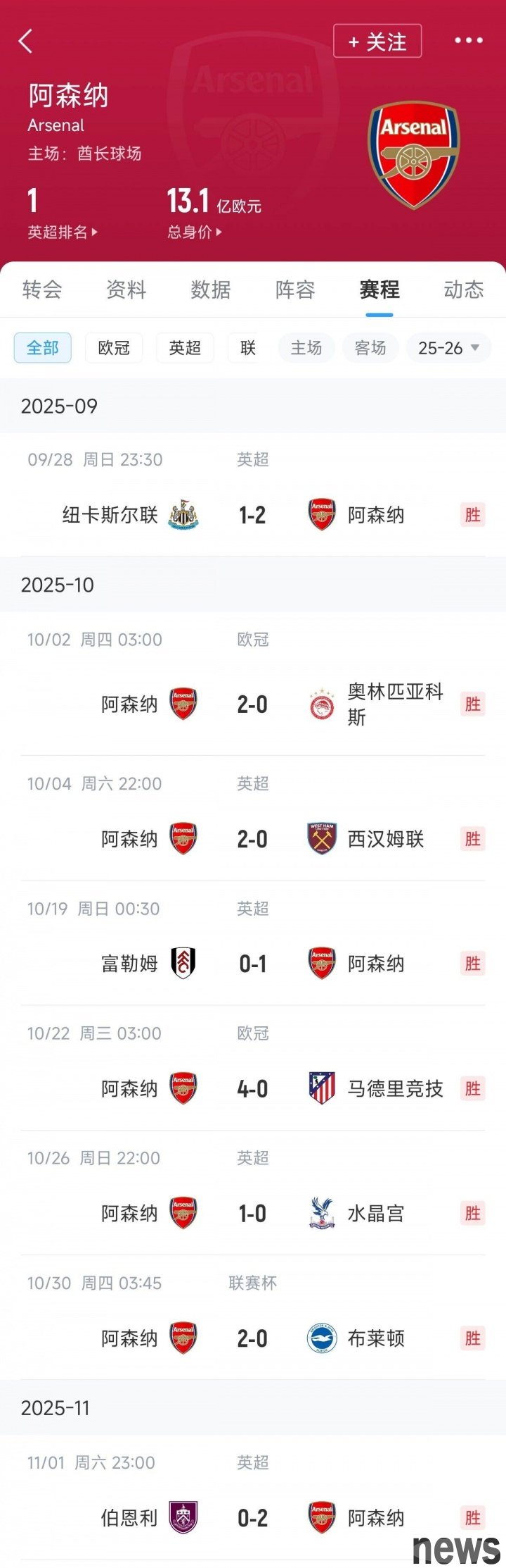 In the 10th round of the Premier League, Arsenal defeated Burnley 2-0 and continued to keep opponents clean.